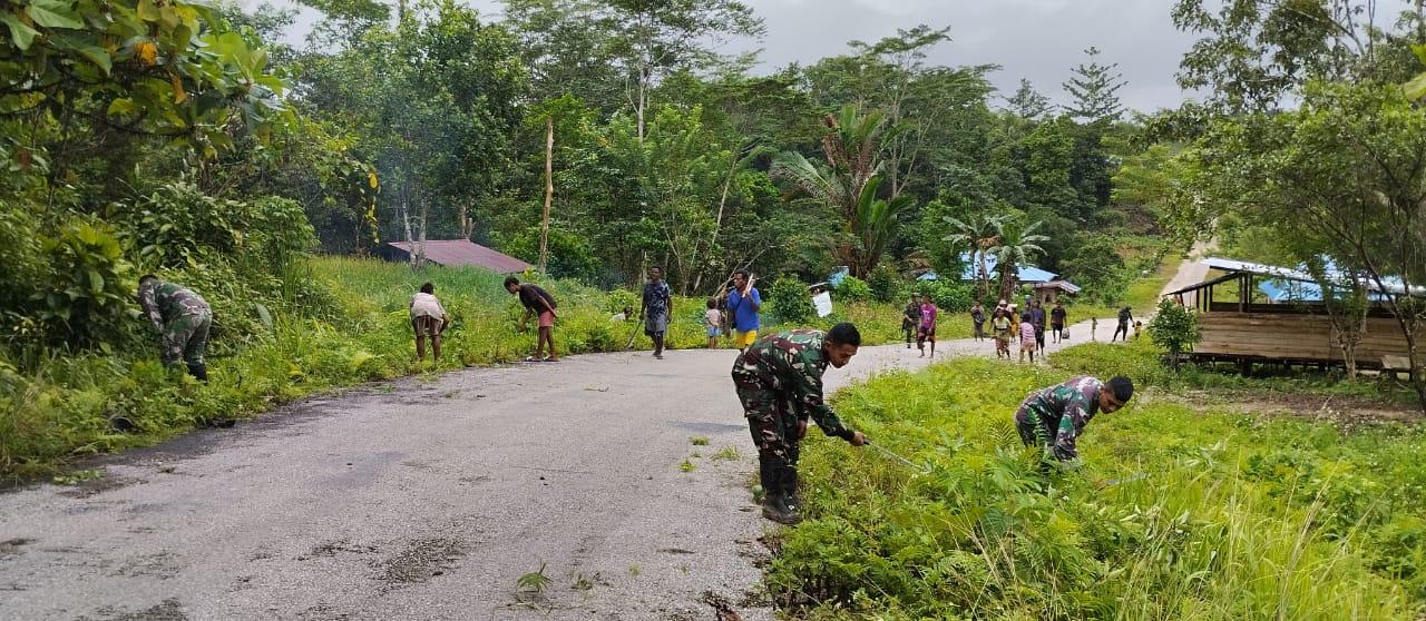 TRIBUNSORONG.COM, KUMURKEK - Hilangkan suasana mencekam di wilayah Maybrat, Satgas Yonif 133/YS bersama warga bahu membahu membersihkan badan jalan.