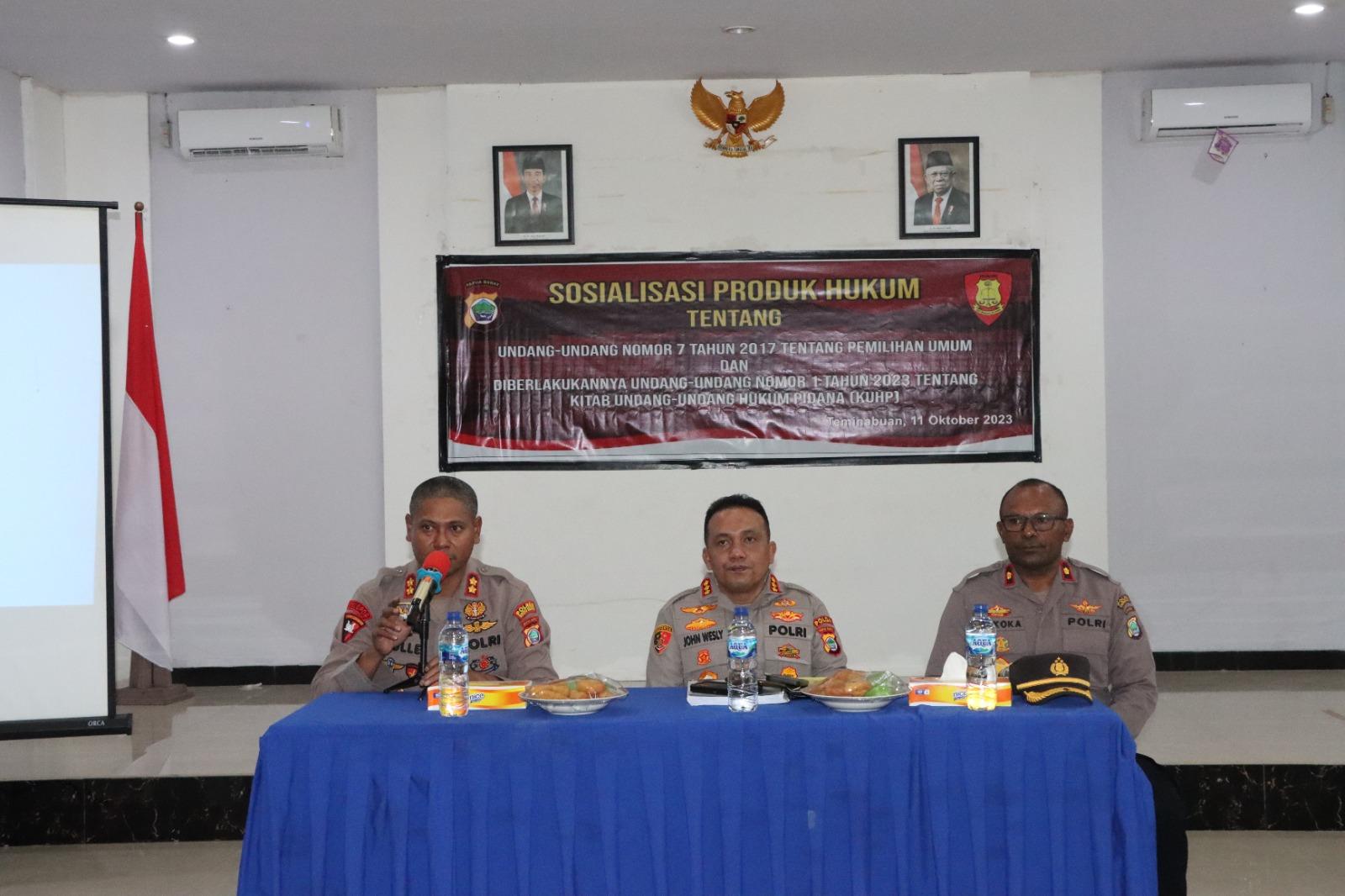 Kapolres Sorong Selatan AKBP Gleen Rooi Molle, dalam sambutannya mengucapkan selamat datang dan terima kasih kepada Kabidkum Polda Papua Barat Kombespol Jhon Wesly Arianto, yang telah berkenan datang ke Polres Sorong Selatan bersama tim dalam rangka memberikan sosialisasi produk hukum tentang Undang-undang nomor 7 Tahun 2017 Tentang Pemilu dan Undang-undang nomor 1 tahun 2023 tentang KUHP.
