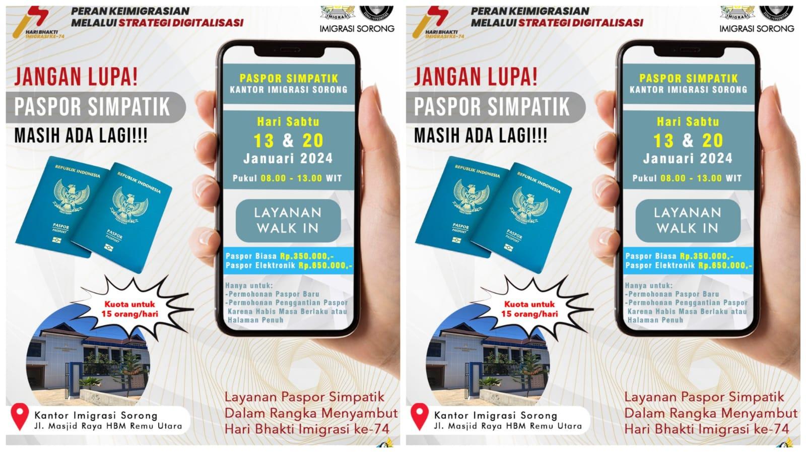 Kantor Imigrasi Kelas II TPI Sorong kembali membuka layanan Paspor Simpatik pada 13 dan 20 Januari 2024.