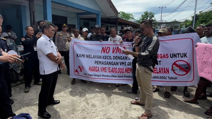 "Kami nelayan kecil menolak tegas pemasangan VMS di kapal berukuran 30 GT. Harga VMS sebesar Rp 15.400.000 sangat memberatkan kami," ujar Irfan Maulana, koordinator aksi di Kantor SDKP.