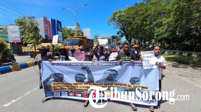 Solidaritas Rakyat Pro Demokrasi dan keluarga empat terdakwa dugaan makar Negara Federal Republik Papua Barat (NFRPB) demo di Kota Sorong.