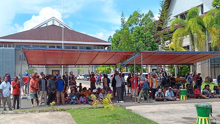 Pendemo mulai membangun tenda persis di depan kantor Gubernur Papua Barat Daya berencana masak dan tidur di depan kantor.